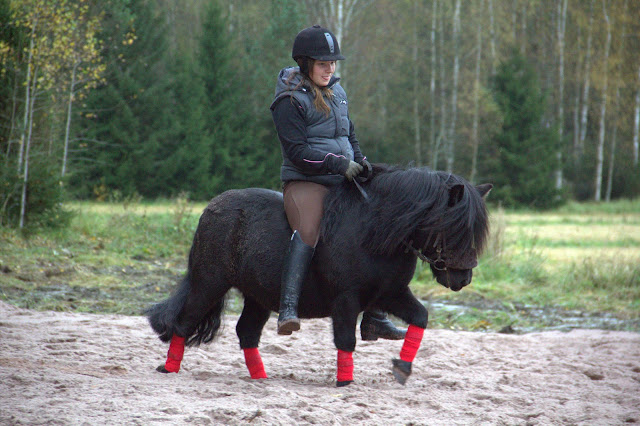 Martta oli tänään niin hieno! Juulia käveli sen kanssa alkajaisiksi pienen maastolenkin ja Martta käveli kokoajan reippaasti, pysähteli vain tosi harvoin ja lähti ravaamaan pohkeesta. Tuollaisen pikkuisen 3-vuotiaan shettistamman kanssa se on huima saavutus! Kentälläkin Martta käveli jo paremmin kuin ensimmäisellä kerralla, pitäisi vaan hommata se häntäremmi, ettei satula valuisi jatkuvasti kaulalle. Lopuksi Juulia meni vielä hetken ilman satulaa ja poni oli villinä, niinpä ratsastaja tippui selästä jälleen kerran..
