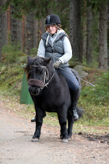 Juulia päätti, että haluaisi kokeilla mitä Riku tuumaisi selkään noususta. Se ei ollut asiasta moksiskaan ja lähdettiinkin sitten hiukan maastoilemaan, harmi vain, että äkkiä tuli tosi pimeää, eikä tiellä meinannut enää edes eteensä nähdä. Olisi pitänyt olla heijastin-varustukset mukana!