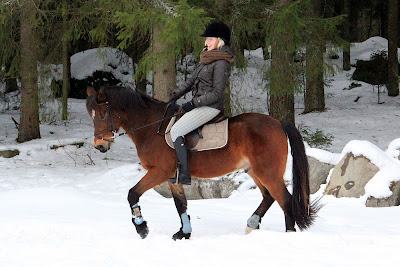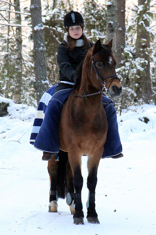 Oli kyllä niin kylmä tänään, että päätettiin jättää raskaammat ratsastukset suosiolla toiseen kertaan ja lähdettiinkin sitten rauhalliselle maastoköpöttelylle. Mulle tuli tänään aiemmin kauhea hinku päästä ratsastamaan Rikulla ja ilmotinkin sitten Juulialle, että sä voit mennä Maitzulla, mä otan Rikun. :D Ja kyllä oli kerrassaan hyvä idea lähteä tallille, vaikka Juulia aluksi kovasti koittikin estellä kovien pakkasten vuoksi; niin ihanaa oli ratsastaa eikä edes tullut kylmä kun osasi pukeutua oikealla tavalla. Itselläni ei siis ollut pelkoakaan, että olisin jäätynyt, toisin kuin Juulialla joka valitti harva se hetki että joka paikka on jäässä.