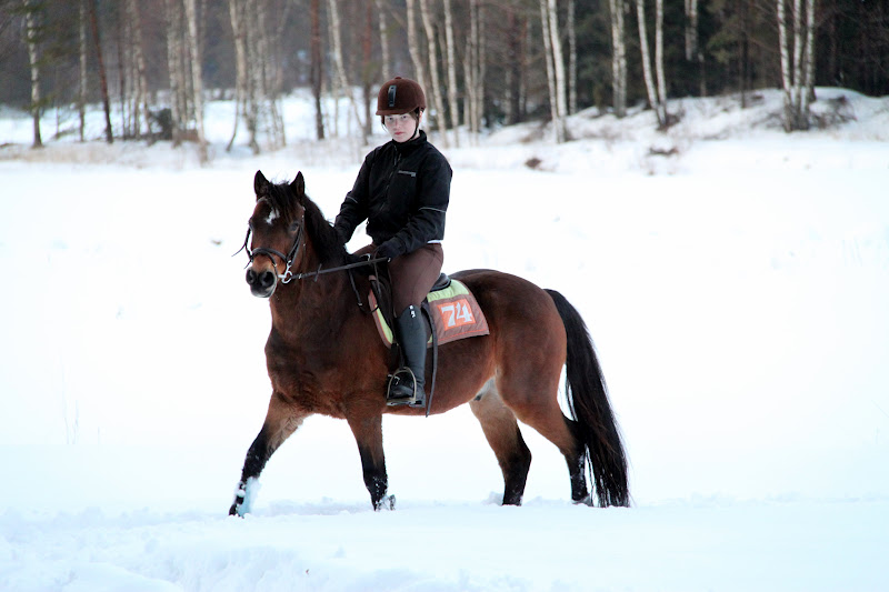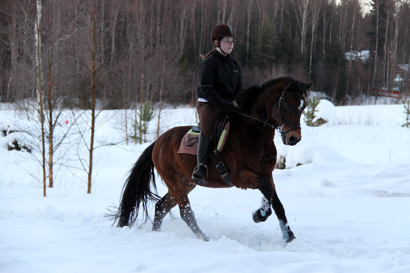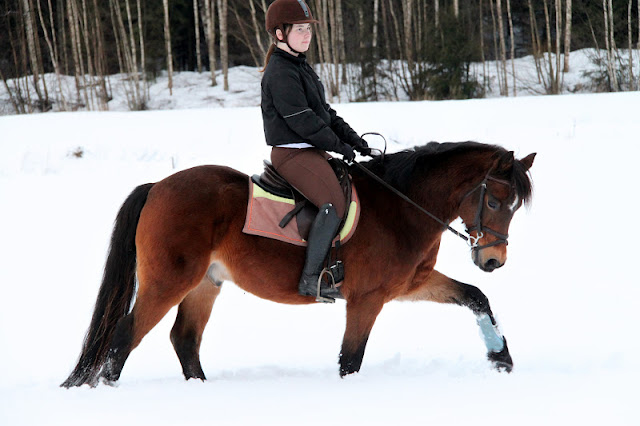 Juulia ratsasti tänään ja minun piti pitää hänelle jonkinmoinen "tunti", muttei siitä mitään tullut, sillä koko päivän on taas pyryttänyt lisää lunta ja kenttä oli jälleen kerran entisäkin kamalemmassa kunnossa. Jonkinmoinen ura siihen pystyttiin kuitenkin tekemään, missä Juulia pystyi sitten ravailemaankin. Käytiin hiukan myös pellolla kokeilemassa, mutta Maitzua kiinnosti enemmän turvallansa lumen tökkiminen kuin jalkoihinsa katsominen. Kun sitten palasimme kentälle, vaikutti kentän yksi sivu jo niin tallautuneelta, että siinä uskalsi ottaa ravia ja hiukan myös laukkaa. Sainkin sitten ihastella kamera kädessä ponin upeaa lisättyä ravia ja keinuhevoslaukkaa. Kuvat puhukoon puolestaan. ;)