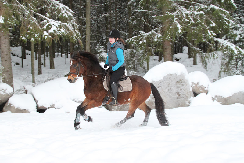 Kentällä saimme kuitenkin harmiksemme huomata, että luntahan oli tullut ihan valtavasti lisää ja kaiken lisäksi se oli suojalunta, joten siinä oli todella raskasta kävellä. Juulia sitten kuitenkin käveli siinä jonkun aikaa, kunnes keksi että voisihan sitä myös pellolle mennä kävelemään. Maitzun mielestä lumi näytti tosi pelottavalta kun siinä ei ollut kukaan aiemmin kävellyt ja kaiken lisäksi lunta oli reilusti ylitse ponin polvien. Siellä Juulia sitten köpötteli jonkin aikaa ja otti myös muutaman lyhyen ravipätkän. Todettiin kuitenkin, että Rikun kanssa tuonne hankeen olisi turha lähteä kävelemään, poni kun on muutenkin hieman huonokuntoinen.. :D