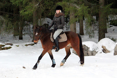 Heippa! Juulia ei tänään ehtinytkään kanssani tallille, joten värväsin ystävämme Hennan mukaan matkaan. Hän lupautuikin pitämään minulle kunnon koulutunnin! :D Ratsastin tänäänkin kentällä ja pettymys oli jälleen kerran suuri, kun näin missä kunnossa kenttä oli. Onneksi sinne oli tehty pikkuinen soikion mallinen ura, jossa pystyi jotenkuten ratsastamaan. En odottanut tältä ratsastuskerralata siis mitään sen kummoisempaa kuin vain kävelyä ja muutamia ravi-pätkiä.. Hennan suunnitelmat poikkesivat kuitenkin hieman omistani, sillä mehän tehtiin vaikka mitä! Aluksi vain kävelin ja keventelin uraa pitkin kunnes poni oli vertynyt. Sen jälkeen vielä hiukan herättelin ponia ja tein siirtymisiä ja muutamia pysähdyksiä. Tämän jälkeen aloitettiinkin sitten kunnon työskentely. Henna päätti, että menisin tänään avoa. Olin hieman kauhuissani, sillä kenttä ei todellakaan ollut missään parhaassa mahdollisessa kunnossa. Mutta ei luoja kun poni oli hyvä! On se vaan niin ihanaa ratsastaa noin osaavalla ponilla. :) Kunhan vielä itse opin ratsastamaan Maitzua paremmin niin eiköhän tästä hyvä tule. Hennankin sisäiset opetus-vaistot kuoriutuivat esiin ja sainkin tosi hyviä vinkkejä ja oli muutenkin kiva kun oli joku kertomassa mitä pitäisi parantaa tai tehdä toisin. No avojen jälkeen vielä hiukan otin pohkeenväistöjä, jotta saisin ponin väistämään enemmän ulkopohjetta ja ne menivät ihan ok. Myös ravissa poni tuntui jälleen kerran paremmalta kuin viimekerralla. Annoin ponin kävellä hetken pitkin ohjin ja kun keräsin ohjat takaisin käsiin, ajattelin vielä hiukan ravailla. Maitzu ei kuitenkaan ollut enää yhtä hyvin kuulolla enkä saanut ratsastettua sitä enää yhtä hyväksi kuin aiemmin tunnin aikana, mutta kun poni lopulta ravasi kivan rentona ja tuntui hyvältä niin päätin lopettaa siihen.