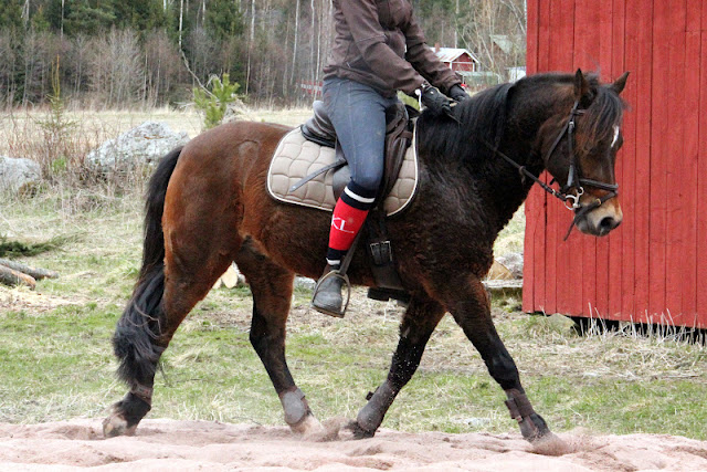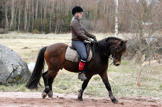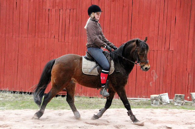 Henna oli tänään mukana pitämässä minulle koulutunnin. Laitoin Maitzun ulkona kuntoon ja sitten kentälle. Poni oli kauhean kyttäilevä, tuijotteli jatkuvasti jonnekkin kaukaisuuteen. Keventelyjen jälkeen otin alkuverkaksi vähän laukkaa kevyessä istunnassa. Ja Maitzu ei kyllä kuunnellut yhtään, posotti vaan menemään ja oikoi yhtä kulmaa oikein kunnon mutkalla niin että ratsastajakin meinasi horjahtaa alas selästä. Siirryin sitten käyntiin ja ratsastin kulman niin, että sain sisäpohkeen menemään kunnolla läpi.